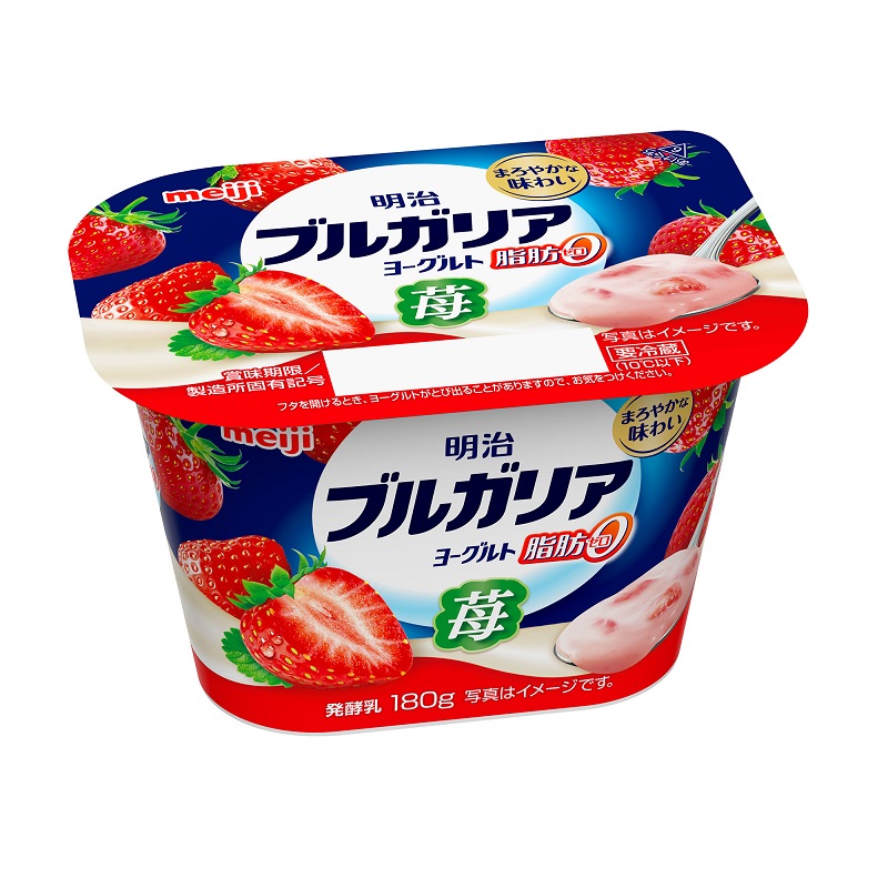 「ブルガリアヨーグルト脂肪0 ジューシー果実苺180g」は、明治の人気フルーツヨーグルトシリーズで、脂肪0ながら苺果肉といちご果汁をたっぷり使ったジューシーな味わいが特徴です。